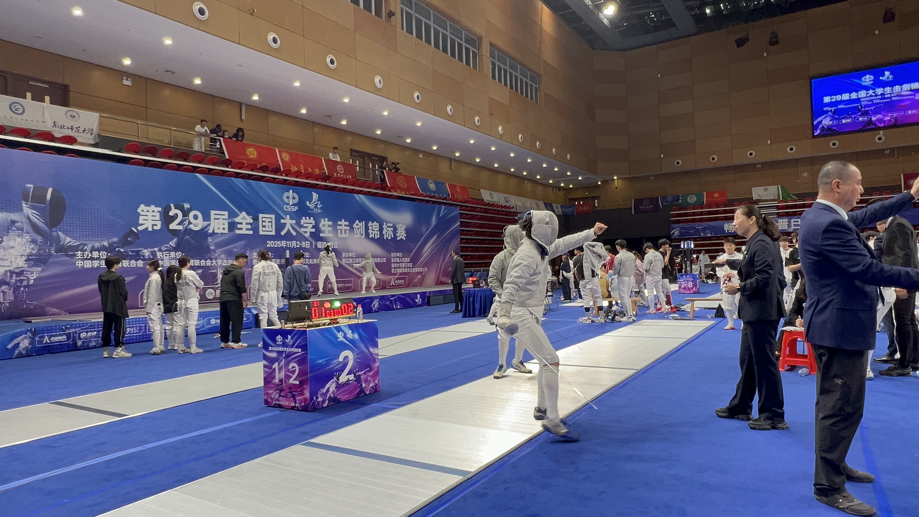 2025年10月31日至11月9日,由中国学生体育联合会主办,中国学生体育联合会大学击剑分会、晋江市人民政府、晋江市文化体育和旅游局联合承办的第29届全国大学生击剑锦标赛在福建省晋江市福州大学(晋江校区)举行。本届赛事涵盖男子、女子花剑、重剑、佩剑的个人赛与团体赛,是目前国内高校规模最大、水平最高、影响最广的击剑盛事,全国101所高校团队参赛。
